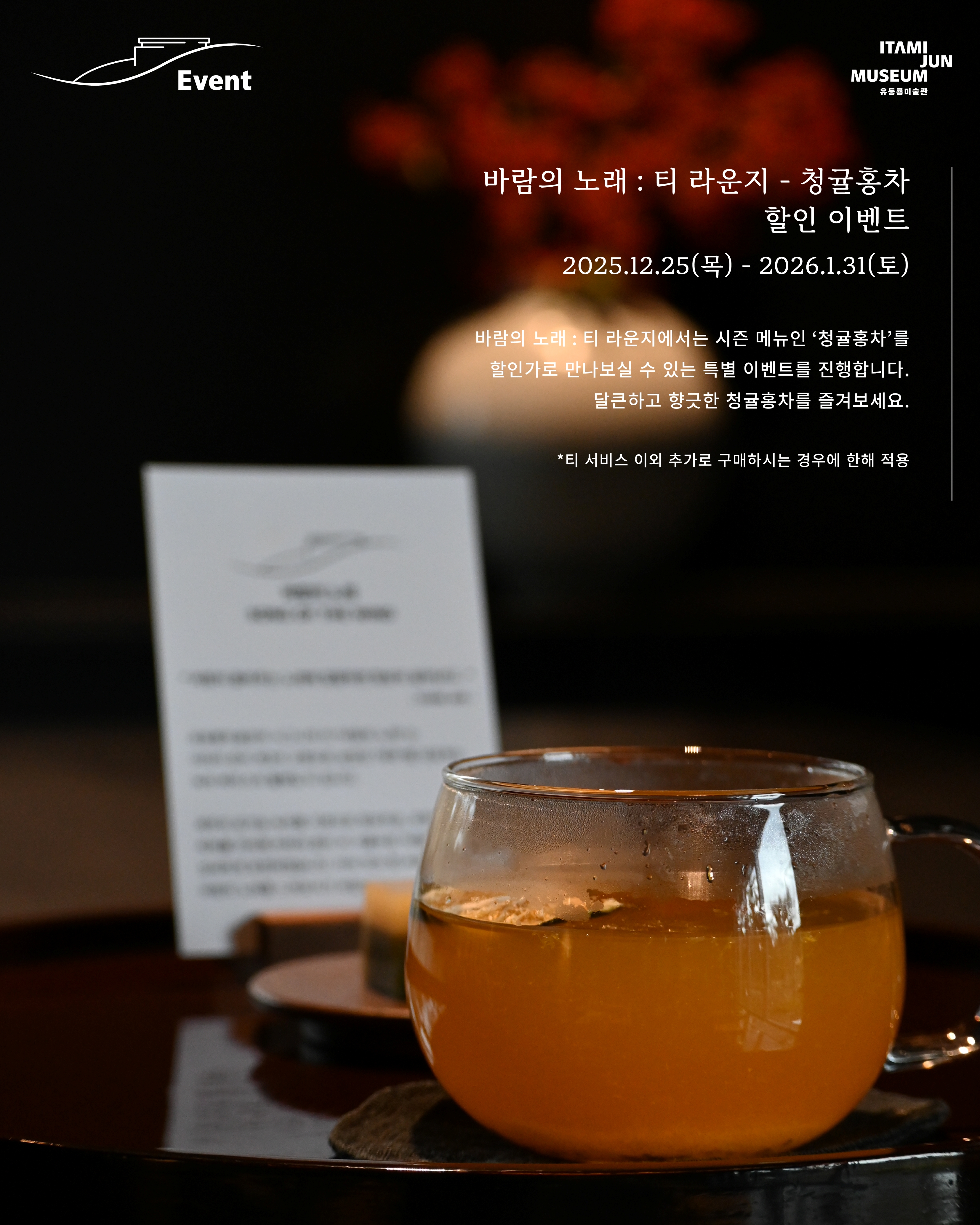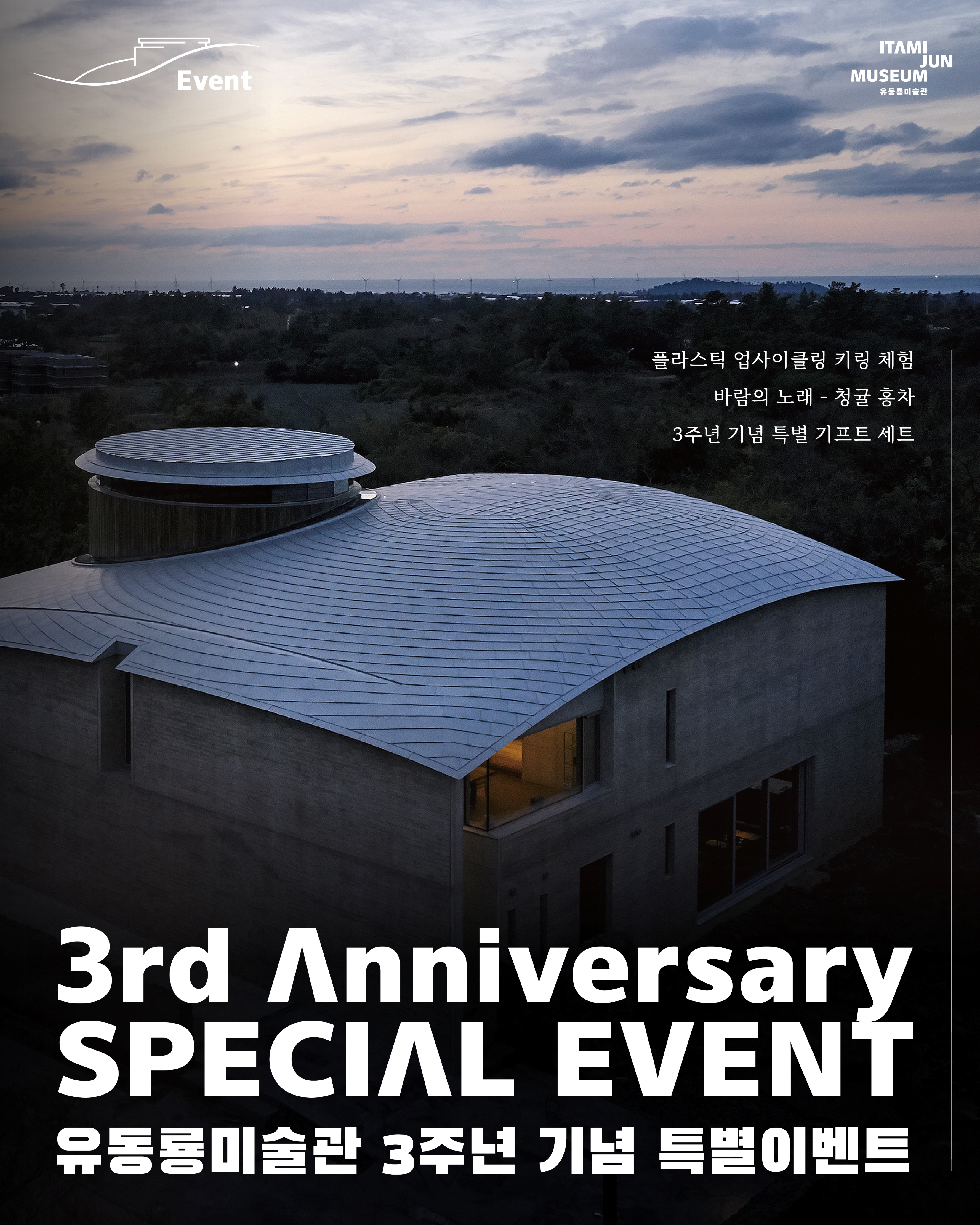 많은 분들의 애정과 관심으로 유동룡미술관이 개관 3주년을 맞이했습니다! 지난 한 해에도 미술관을 찾아주신 모든 분들께 진심으로 감사드리며, 3주년 기념 특별 이벤트를 진행합니다! 1월 말까지 한 달간, 체험 프로그램부터 할인 이벤트까지, 다양한 이벤트를 진행하오니 많은 관심과 참여 부탁드립니다. 1. 플라스틱 업사이클링 키링 체험 2026.1.3(토)~1.4(일) 유동룡미술관의 ‘업사이클링 프로젝트’ 중 하나로, 버려진 플라스틱 병뚜껑을 활용해 키링으로 제작해보는 무료 체험 프로그램을 진행합니다. - 신청 방법 및 안내 *당일 관람객을 대상으로 예약 타임별 현장 선착순 신청 *30분 단위 타임별 / 한 타임당 4명까지 진행 *높은 온도의 도구를 사용하므로 체험 동의서를 작성합니다. *참여자당 1개의 키링 제작 ㅤ ㅤ 2. 바람의 노래 : 티 라운지 - 청귤홍차 할인 이벤트 2025.12.25(목) ~ 2026.1.31(토) 바람의 노래 : 티 라운지에서는 시즌 메뉴인 ‘청귤홍차’를 할인가로 만나보실 수 있는 특별 이벤트를 진행합니다. 달큰하고 향긋한 청귤홍차를 즐겨보시기 바랍니다. *티 서비스 이외 추가로 구매하시는 경우에 한해 할인가가 적용됩니다. ㅤ ㅤ 3. 뮤지엄 스토어 - 3주년 기념 기프트 세트 2025.12.25(목) ~ 2026.1.31(토) 유동룡미술관 개관 3주년 기념으로 미술관의 아트상품 기프트 세트를 할인가로 판매합니다. 다양한 상품들을 특별 할인가로 만나보세요! - 정가에서 약 40% 할인가 적용 : 170,000 원 ㅤ * 기프트 세트 상품 구성 (기프트 상자 포장) 2026 이타미 준 드로잉 캘린더/ 이타미 준 회화 우양산/ 유동룡미술관 시그니처 향 스프레이(한서형 작가)/ 이타미 준 회화 머그컵 2종/ 이타미 준 회화 마그넷 4종/ 도서 「이타미 준 나의 건축」/ 수풍석 오두제 3종 세트/ 각인 연필 3종 세트/ 이타미 준 회화 리유저블 백(대) |