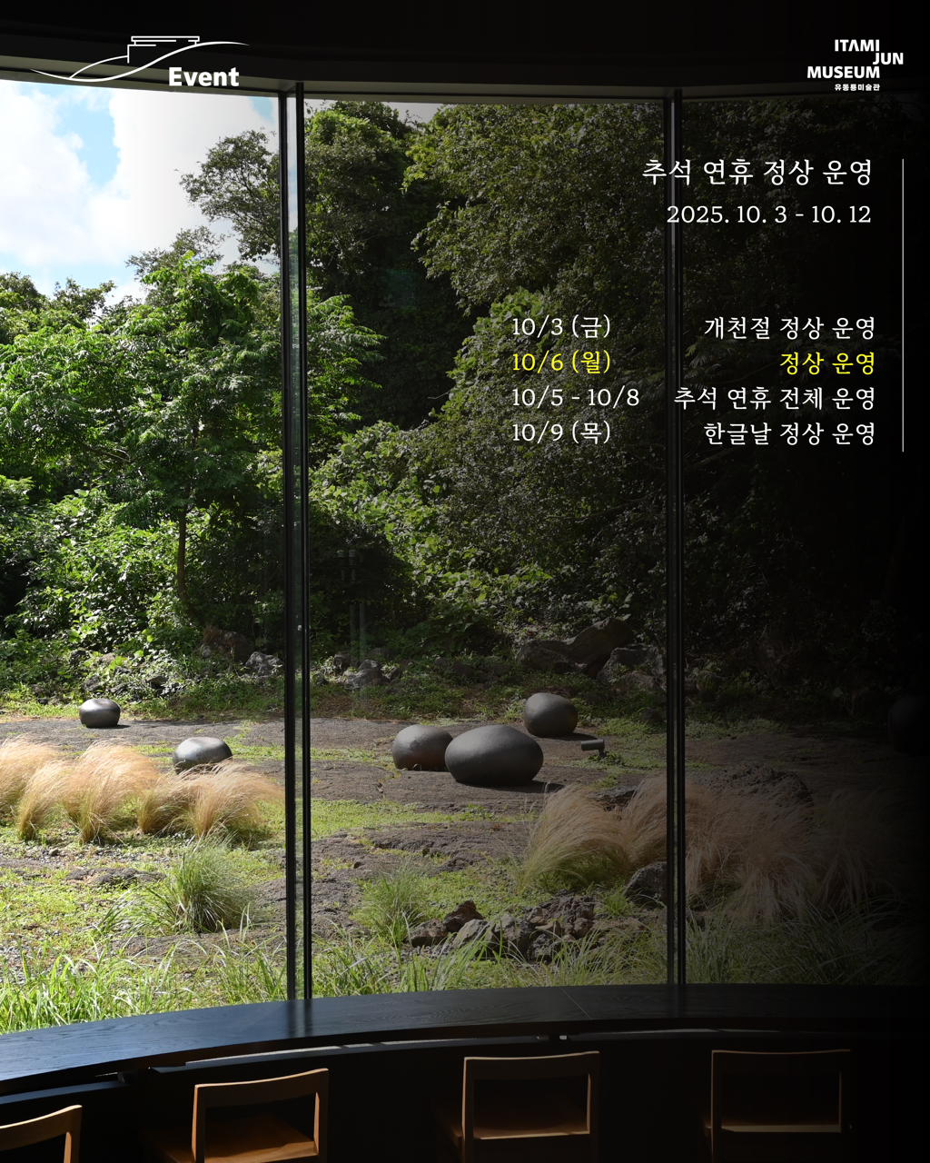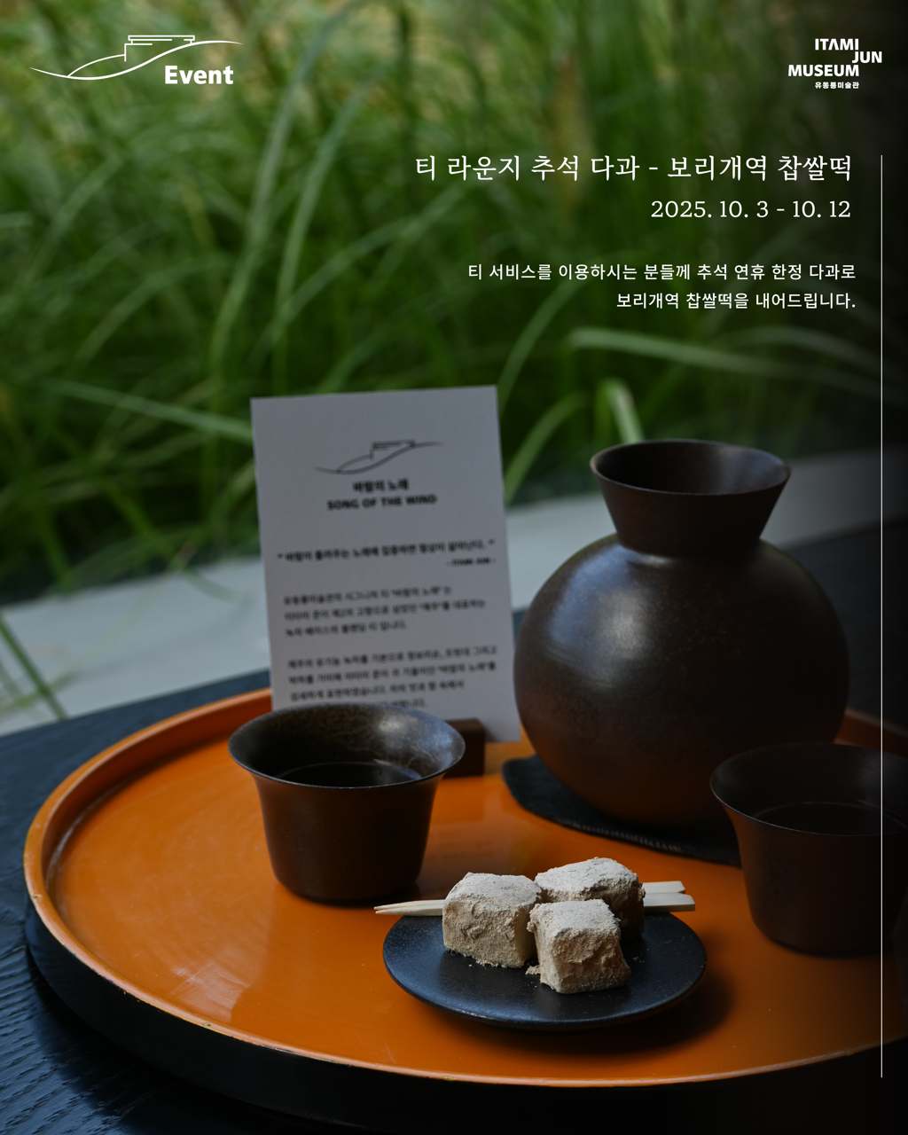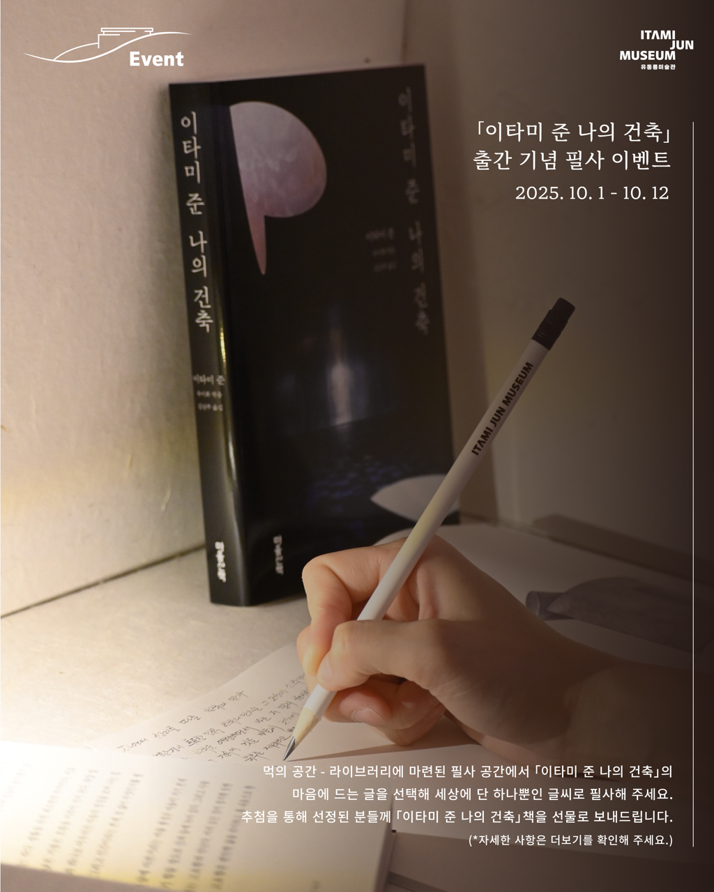 1. [ 「이타미 준 나의 건축」 출간 기념 필사 이벤트] 기간 : 2025. 10. 1(수) ~ 10. 12(일) 세상에 단 하나뿐인 글씨로 필사해 주세요. 추첨을 통해 선정된 분들께 「이타미 준 나의 건축」 을 선물로 보내드립니다. 기간 : 2025. 10. 1(수) ~ 10. 12(일) 뮤지엄 리유저블 컵 (1개) / 업사이클링 키링 (1개) 제주 보리와 콩을 갈아 만든 가루인 보리개역(가루)을 고물로 묻힌 특별 다과를 만나보세요.