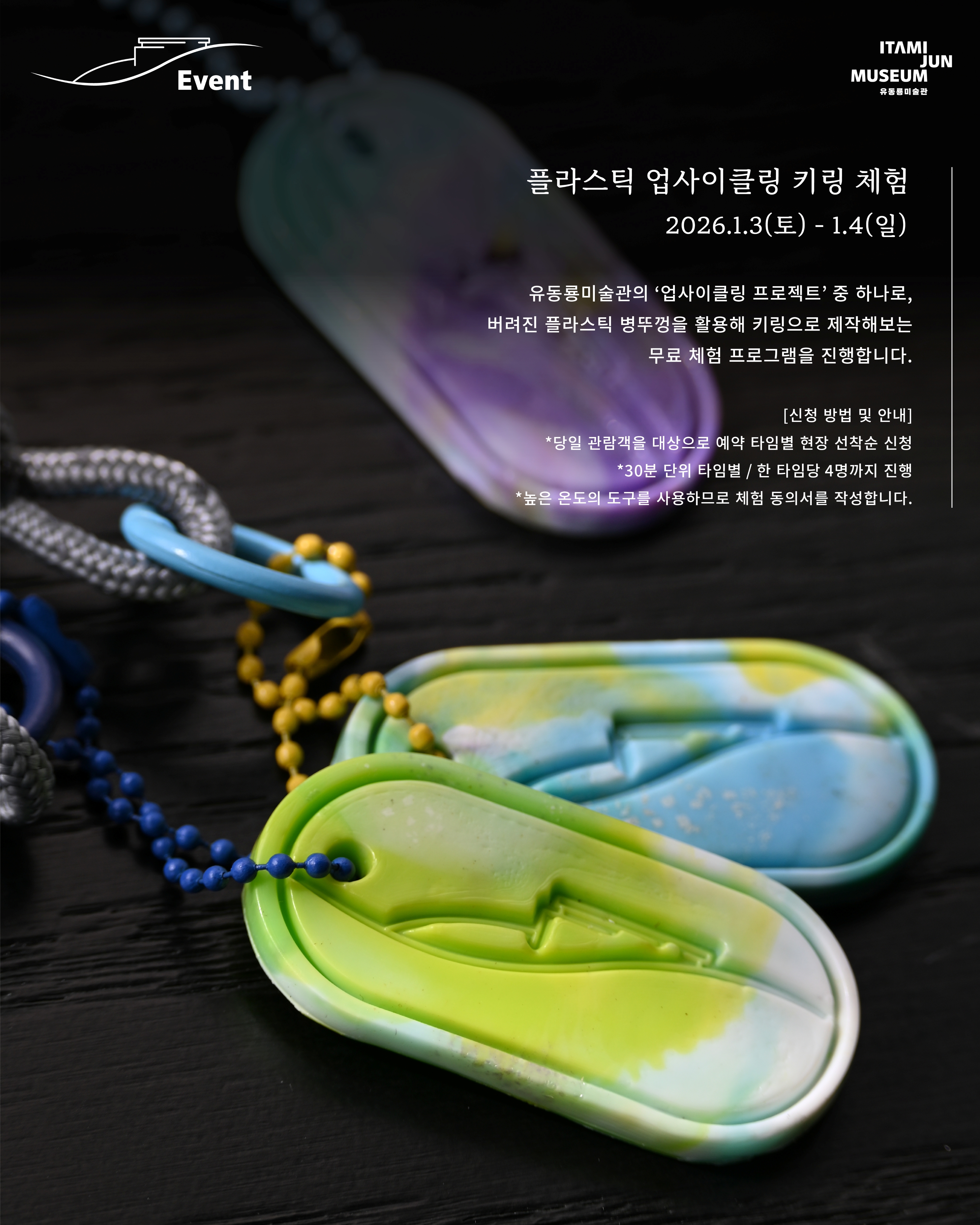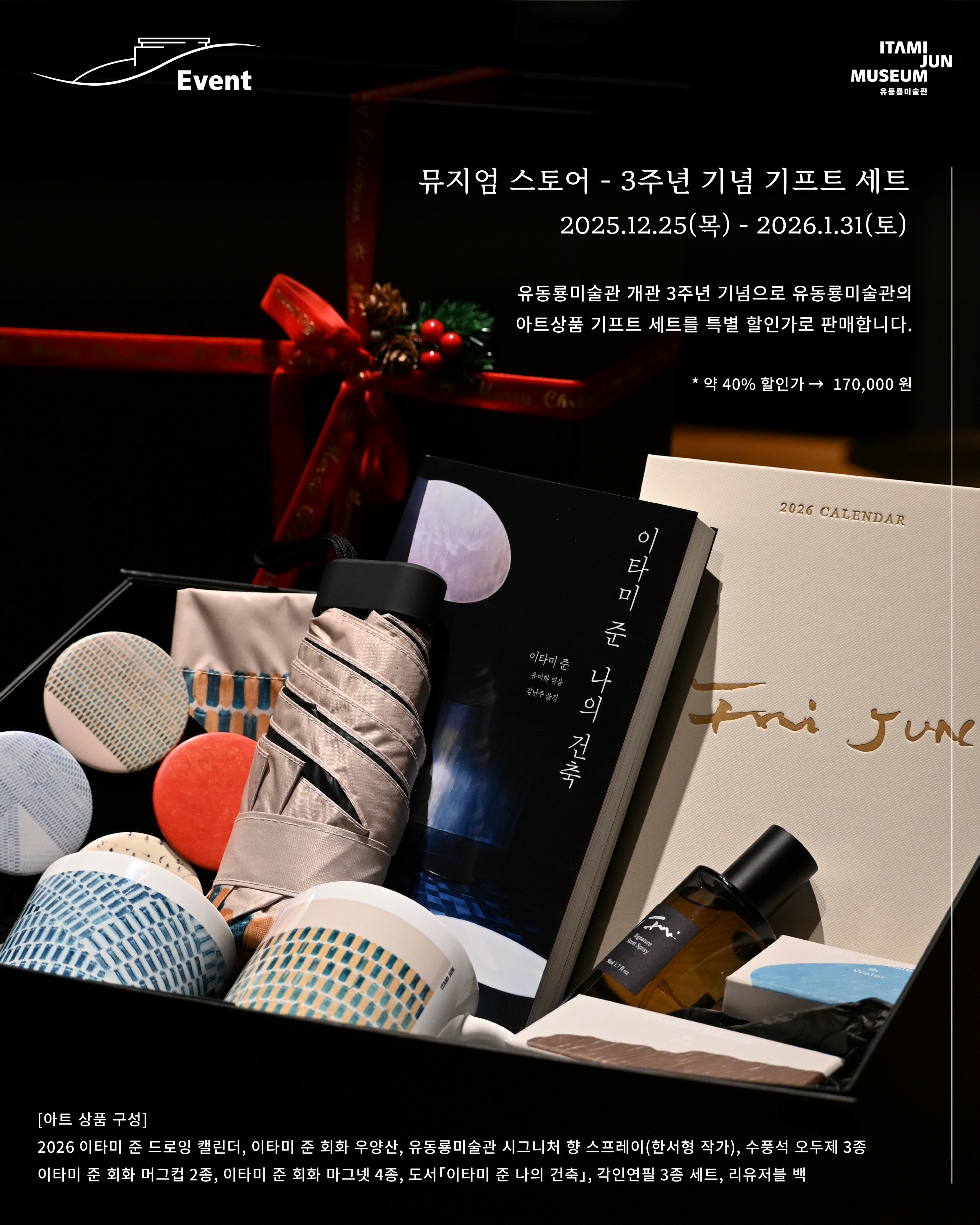 많은 분들의 애정과 관심으로 유동룡미술관이 개관 3주년을 맞이했습니다! 지난 한 해에도 미술관을 찾아주신 모든 분들께 진심으로 감사드리며, 3주년 기념 특별 이벤트를 진행합니다! 1월 말까지 한 달간, 체험 프로그램부터 할인 이벤트까지, 다양한 이벤트를 진행하오니 많은 관심과 참여 부탁드립니다. 1. 플라스틱 업사이클링 키링 체험 2026.1.3(토)~1.4(일) 유동룡미술관의 ‘업사이클링 프로젝트’ 중 하나로, 버려진 플라스틱 병뚜껑을 활용해 키링으로 제작해보는 무료 체험 프로그램을 진행합니다. - 신청 방법 및 안내 *당일 관람객을 대상으로 예약 타임별 현장 선착순 신청 *30분 단위 타임별 / 한 타임당 4명까지 진행 *높은 온도의 도구를 사용하므로 체험 동의서를 작성합니다. *참여자당 1개의 키링 제작 ㅤ ㅤ 2. 바람의 노래 : 티 라운지 - 청귤홍차 할인 이벤트 2025.12.25(목) ~ 2026.1.31(토) 바람의 노래 : 티 라운지에서는 시즌 메뉴인 ‘청귤홍차’를 할인가로 만나보실 수 있는 특별 이벤트를 진행합니다. 달큰하고 향긋한 청귤홍차를 즐겨보시기 바랍니다. *티 서비스 이외 추가로 구매하시는 경우에 한해 할인가가 적용됩니다. ㅤ ㅤ 3. 뮤지엄 스토어 - 3주년 기념 기프트 세트 2025.12.25(목) ~ 2026.1.31(토) 유동룡미술관 개관 3주년 기념으로 미술관의 아트상품 기프트 세트를 할인가로 판매합니다. 다양한 상품들을 특별 할인가로 만나보세요! - 정가에서 약 40% 할인가 적용 : 170,000 원 ㅤ * 기프트 세트 상품 구성 (기프트 상자 포장) 2026 이타미 준 드로잉 캘린더/ 이타미 준 회화 우양산/ 유동룡미술관 시그니처 향 스프레이(한서형 작가)/ 이타미 준 회화 머그컵 2종/ 이타미 준 회화 마그넷 4종/ 도서 「이타미 준 나의 건축」/ 수풍석 오두제 3종 세트/ 각인 연필 3종 세트/ 이타미 준 회화 리유저블 백(대) |