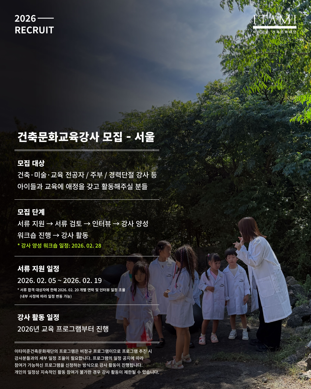 [이타미준건축문화재단 2026 건축문화교육강사 모집] 이타미준건축문화재단 2026 신규 건축문화교육강사를 모집합니다! 이번 모집은 '서울/경기' 지역을 중심으로 활동해주실 분들을 대상으로 하며, 2026년 동안 이타미준건축문화재단과 유동룡미술관의 프로그램 강사 및 보조강사로서 함께 합니다. 이타미준건축문화재단은 2021년부터 서울 그리고 2023년부터는 제주의 유동룡미술관을 거점으로 <이타미준 마스터클래스>, <찾아가는 건축 학교> 등 내부 프로그램을 비롯하여, 교육기관 및 기업 협력 프로그램들을 통해 건축문화교육을 이어가고 있습니다. 이타미 준의 철학에 공감하고, 어린이부터 성인까지 다양한 연령층의 대상과 함께 예술과 건축을 중심으로 소통해주실 강사분들을 모집하오니 많은 관심과 지원 부탁드립니다. [2026 건축문화교육강사 모집 - 서울] 활동 지역 서울/경기 지역 활동 모집 대상 건축, 미술, 교육 전공자 주부 및 경력단절 강사 등 아이들과 재단의 교육에 애정을 갖고 활동해주실 분들 모집 단계 서류 지원 - 인터뷰(서류합격자 대상) - 강사 양성 워크숍 참여 - 강사 활동 진행 서류 지원 일정 2026. 2. 5(목) ~ 2026. 2. 19(목) 서류 합격 대상자에 한해 개별적인 연락 진행 후, 인터뷰 예정 *사전 워크숍 일정(예정) : 2026. 2. 28(토) 지원 방법 유동룡미술관 홈페이지 내 지원서 다운로드하여 작성 후 제출 ▶링크 첨부파일 다운로드 [지원서 제출 메일 : itamijunfoundation@gmail.com] 강사 활동 일정 3월부터 예정 / 2026년 교육 프로그램 *활동 실적에 따라 2027년 연장 진행 가능 *이타미준건축문화재단의 프로그램은 비정기적 프로그램으로, 월별 사전 프로그램 일정 공고 시, 해당 일정에 참여가 가능한 강사분들의 신청을 받아 진행됩니다. 개인 일정상 지속적인 활동 참여가 불가한 경우 강사 활동이 제한될 수 있습니다. 강사 활동비 활동비는 강사/보조강사로서 참여하는 프로그램 별로 정산/지급되며, 내부 강사비 지급 규정에 따릅니다. 강사 활동 혜택 -건축문화교육강사 활동증명서 발급 -건축문화교육강사 활동 키트 증정 (유동룡미술관 아트 상품) -유동룡미술관 본인 관람 무료 + 초대권 3장 (*본인은 활동 연도에 한해(2026년) / 초대권은 해당 연도 기간 내 사용) - 이타미준건축문화재단 2026/2027 캘린더 제공 문의 메일 문의 / itamijunfoundation@gmail.com