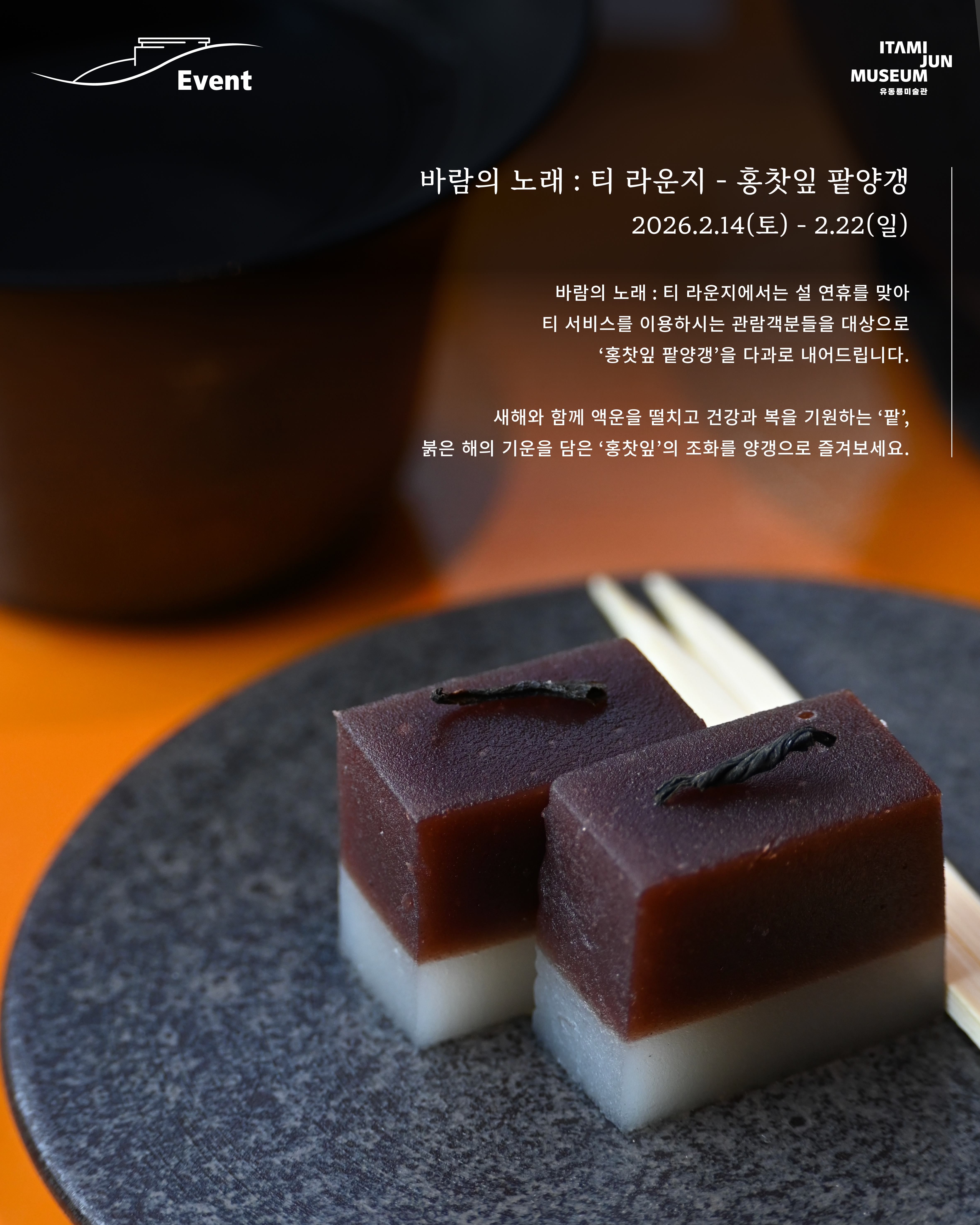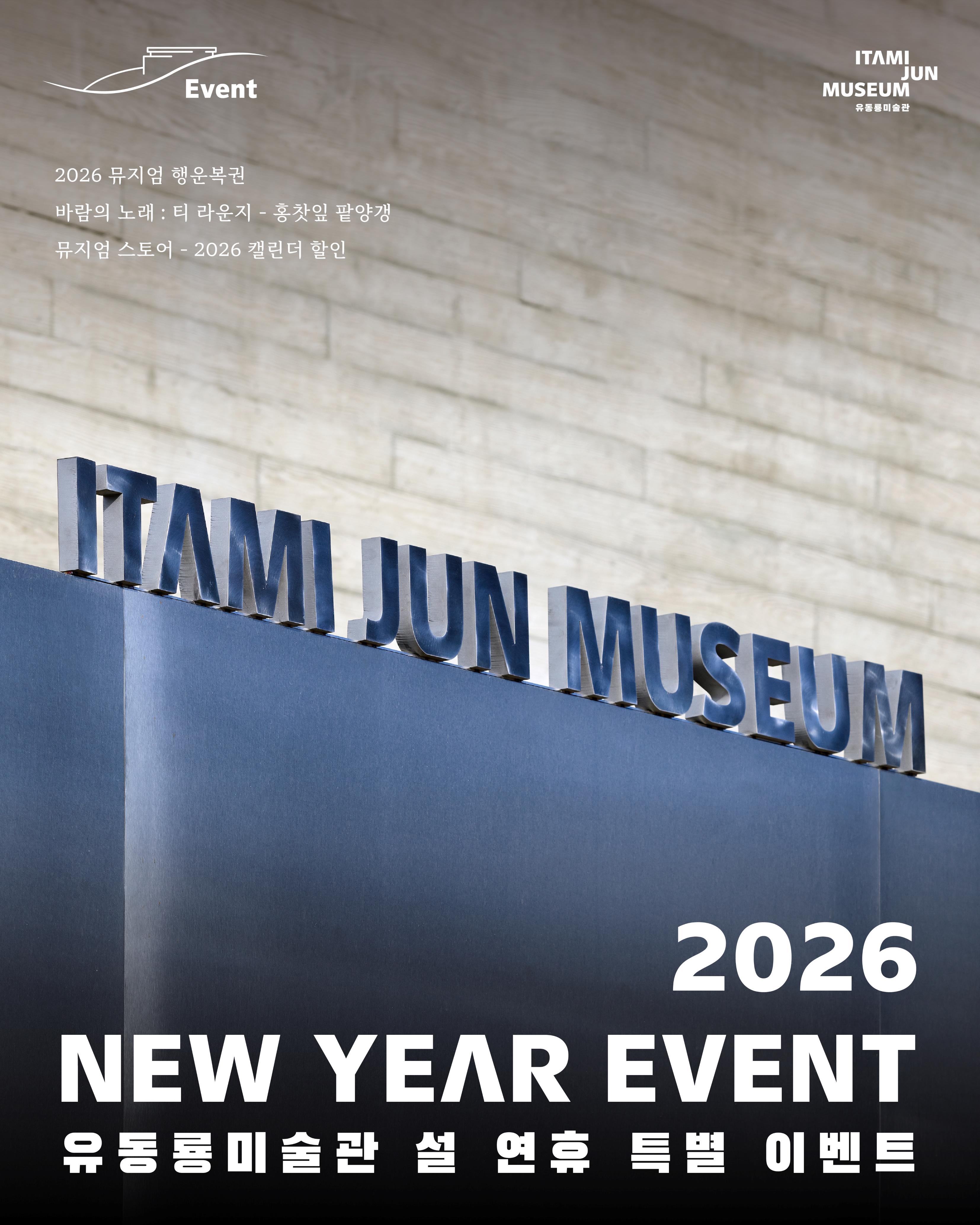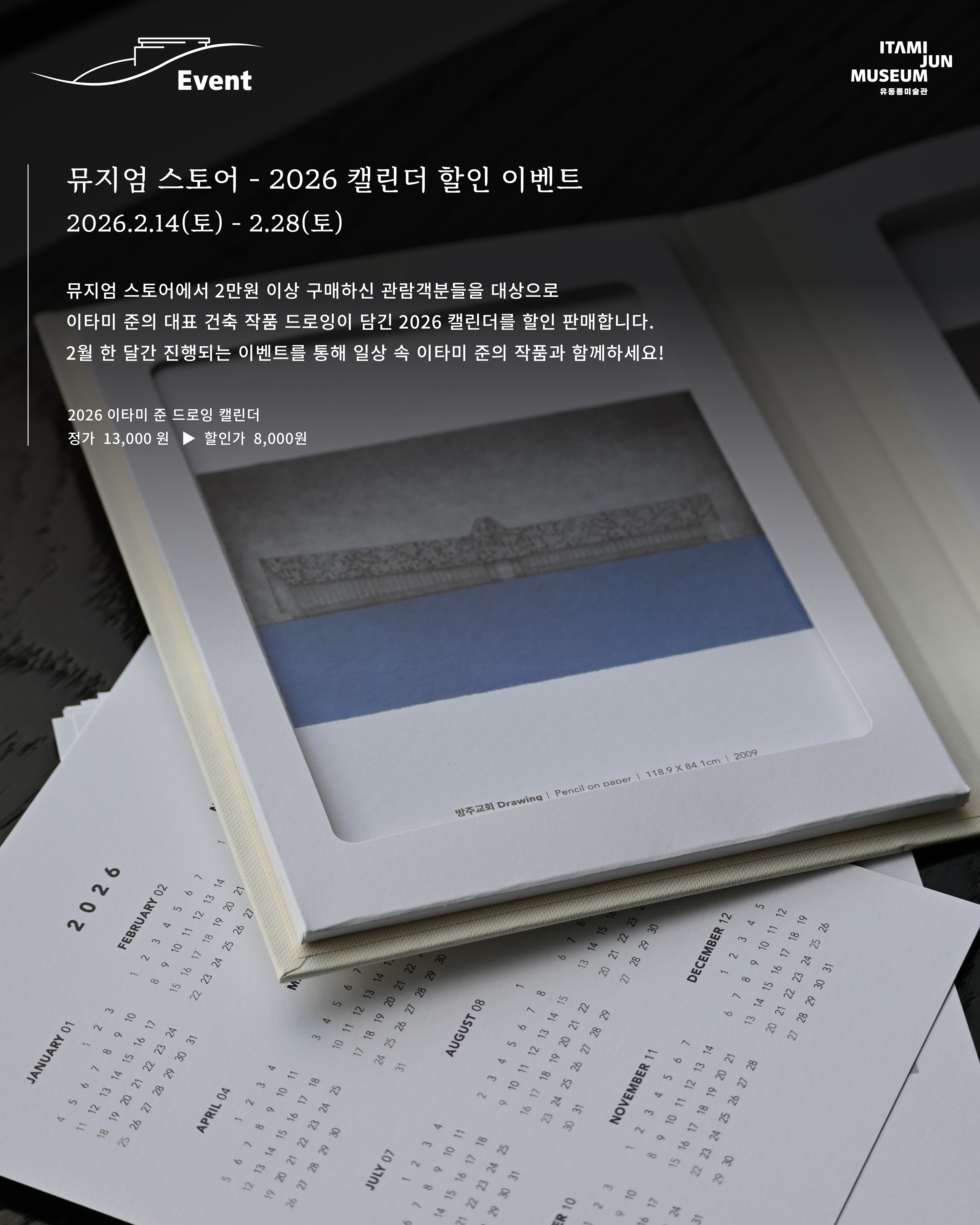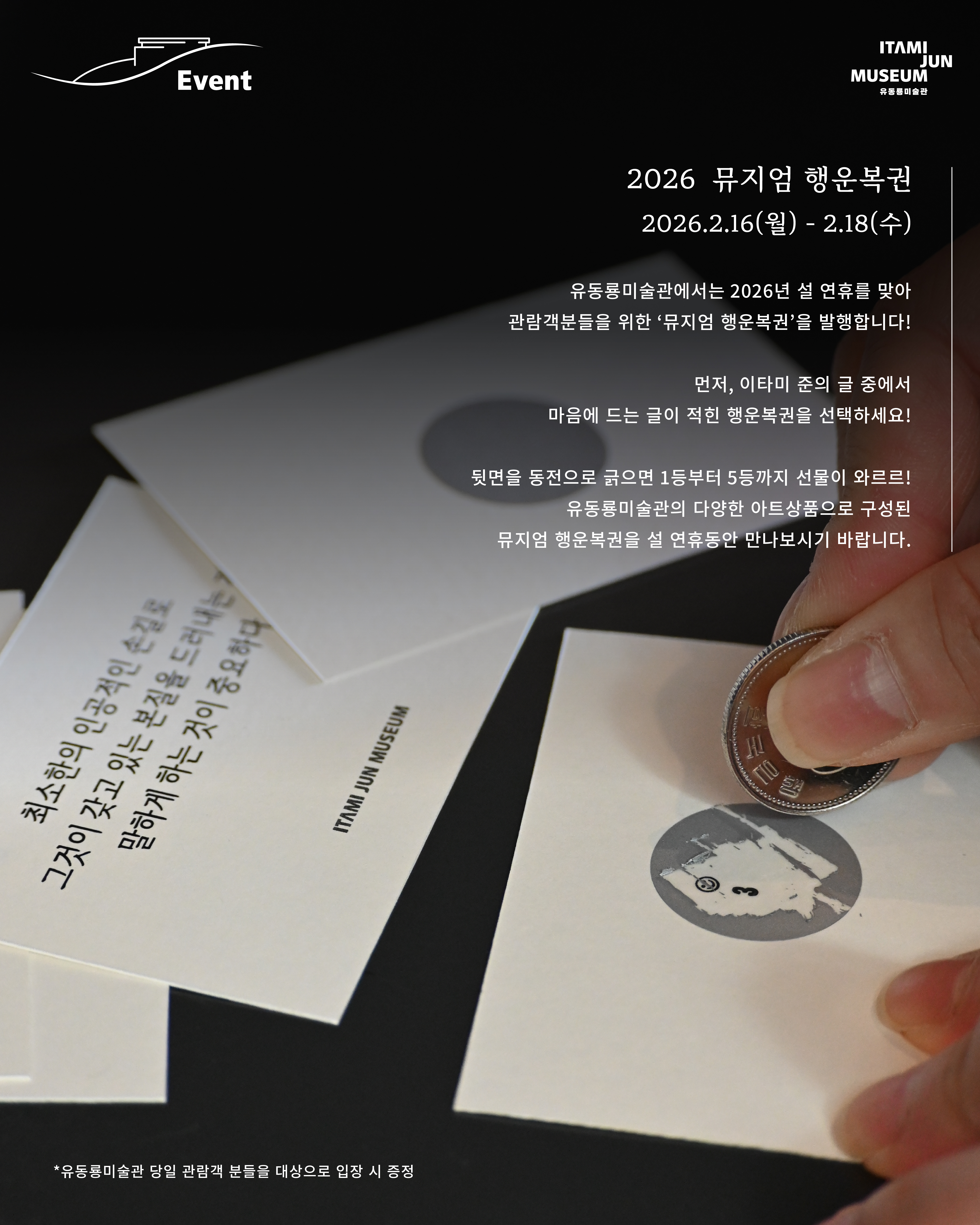 유동룡미술관은 2026년 설 연휴를 맞아 관람객분들과 함께하는 설 연휴 특별 이벤트를 준비하였습니다! 새해 맞이 선물이 와르르 ‘뮤지엄 행운복권’부터, 건강과 복을 기원하는 티 라운지의 특별 다과 ‘홍찻잎 팥양갱’, 그리고 스토어의 ‘2026 캘린더 할인’ 이벤트까지! 소중한 분들과 함께하는 설 연휴, 유동룡미술관에서 또 다른 추억을 만들어보시기 바랍니다.✨ ㅤ ㅤ 1) 뮤지엄 행운복권 2026.2.16(월) ~ 2.18(수) 2026년 설 연휴를 맞아 유동룡미술관에서는 관람객분들을 위한’ 뮤지엄 행운복권’을 발행합니다! 먼저, 이타미 준의 글 중에서 마음에 드는 글이 적힌 행운복권을 선택하세요!뒷면을 동전으로 긁으면 1등부터 5등까지 선물이 와르르!!!!! 유동룡미술관의 다양한 아트상품으로 구성된 뮤지엄 행운복권을 설 연휴동안 만나보시기 바랍니다. *뮤지엄 행운복권 경품 1등: 방주교회 아트프린트 액자 – 3명 2등: 드로잉 아크릴 마그넷 세트(5ea) – 10명 3등: 2026 캘린더 – 20명 4등: 뮤지엄 파우치 – 50명 5등: 이타미 준 드로잉 엽서 1매 (*랜덤제공) 2) 바람의 노래 : 티 라운지 - 홍찻잎 팥양갱 2026.2.14(토) ~ 2.22(일) 바람의 노래 : 티 라운지에서는 설 연휴를 맞아 티 서비스를 이용하시는 관람객분들을 대상으로 ‘홍찻잎 팥양갱’을 다과로 내어드립니다. 새해와 함께 액운을 떨치고 건강과 복을 기원하는 ‘팥’, 붉은 해의 기운을 담은 ‘홍찻잎’의 조화를 양갱으로 즐겨보세요! 3) 뮤지엄 스토어 - 2026 캘린더 할인 이벤트 2026.2.14(토) ~ 2.28(토) 뮤지엄 스토어에서 2만원 이상 구매하신 관람객분들을 대상으로 이타미 준의 대표 건축 작품 드로잉이 담긴 2026 캘린더를 할인 판매합니다. 2월 한 달간 진행되는 이벤트를 통해 일상 속 이타미 준의 작품과 함께하세요! [2026 이타미 준 드로잉 캘린더] 정가 13,000 원 ▶ 할인가 8,000 원 |